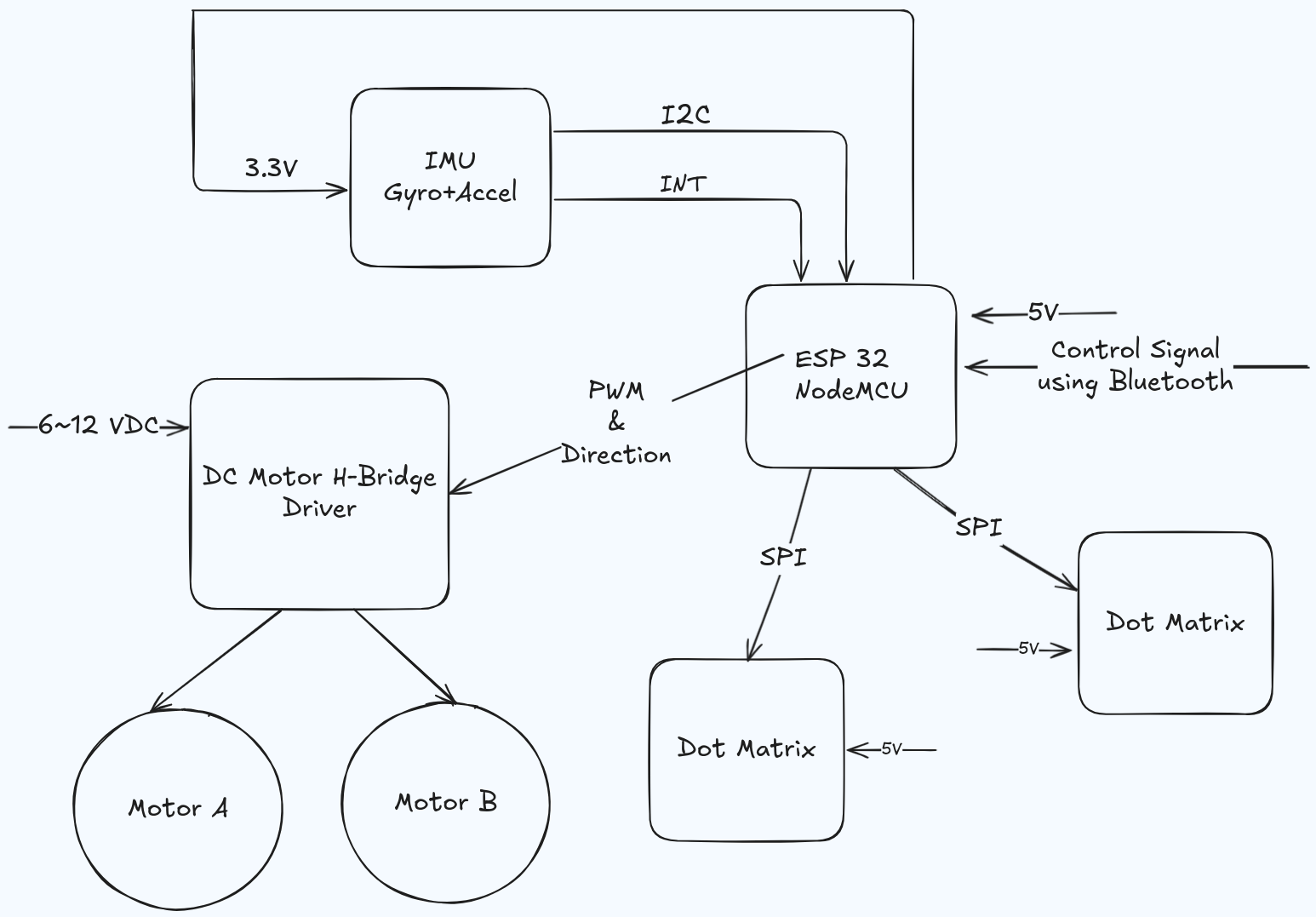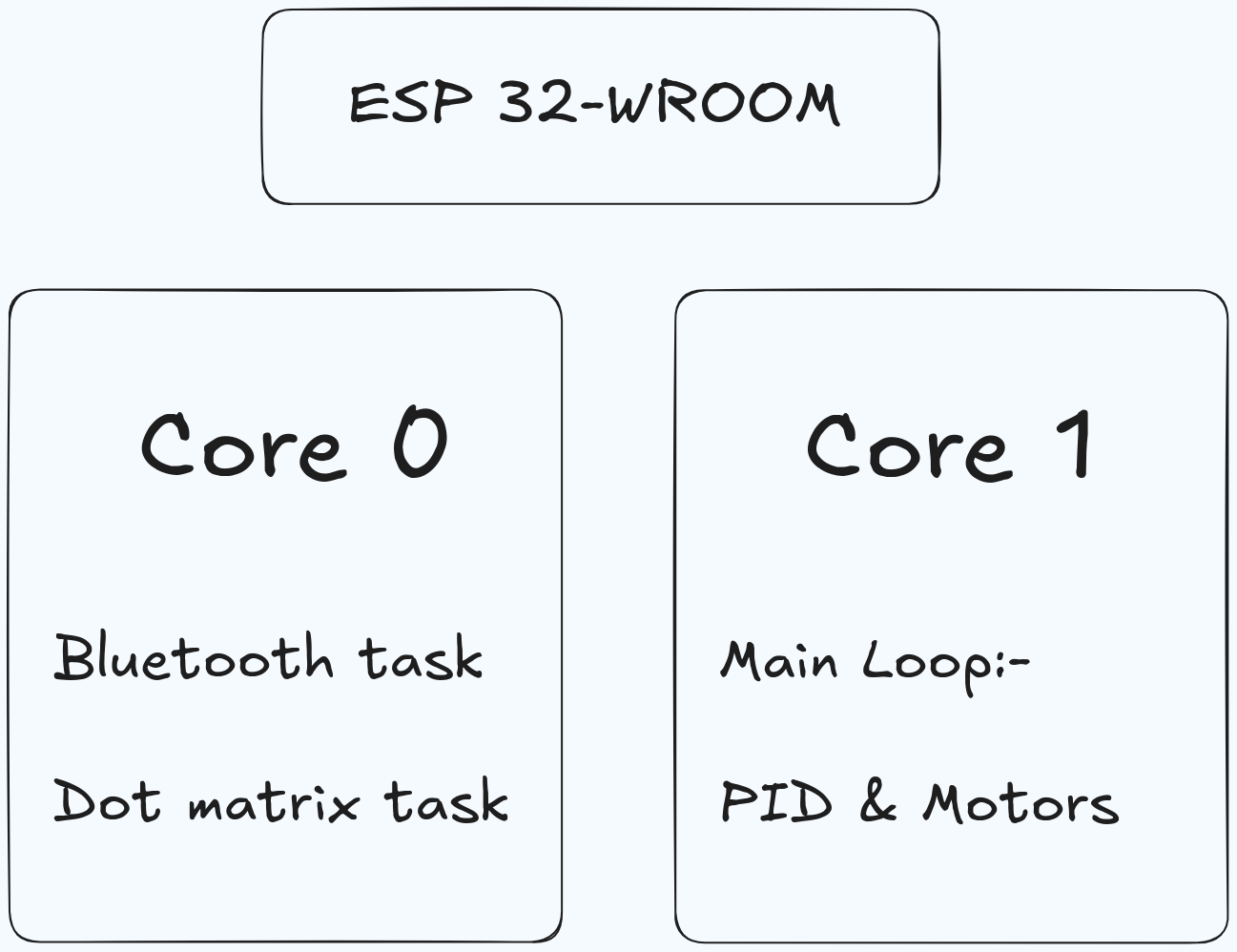 We decided to isolate the PID and motor control code and leave it running on the main loop, but we move all the other code i.e (Bluetooth, Dot Matrix) to the other core (0) and added them inside tasks to let the RTOS handle the multitasking.